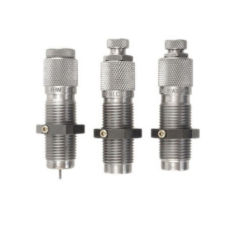 Lyman Carbide 3-Die Sets include a full length sizing die with carbide sizing ring and decapping unit, a 2-step expander die and a bullet seating die. No sizing lube is required with these carbide dies. Shellholder sold separately.
