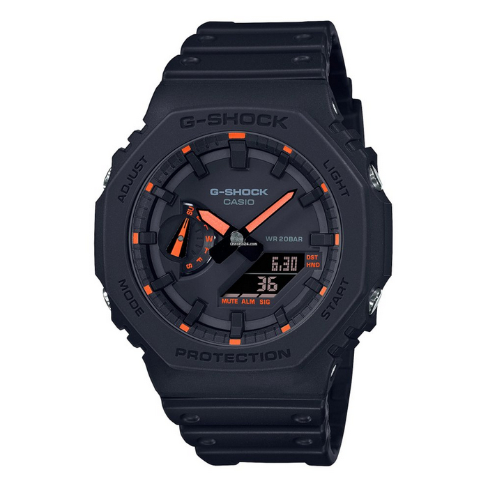 Make a splash with color set against matte black in a special design that pops with neon accents. The octagonal shape and streamlined design of the GA-2100 puts on textured matte black and vibrant neon color for a stylishly cool new look. Hour and minute hands with phosphorescent paint stay visible in the dark to keep you on your game all day and night.