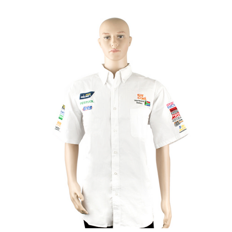 The shirt represents the Vermont Sales company. The leading brands are embroidered on the sleeves and the chest.